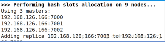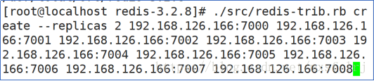 ./src/redis-trib.rb create --replicas 2 192.168.220.135:7000 192.168.220.135:7001 192.168.220.135:7002 192.168.220.135:7003 192.168.220.135:7004 192.168.220.135:7005 192.168.220.135:7006 192.168.220.135:7007 192.168.220.135:7008