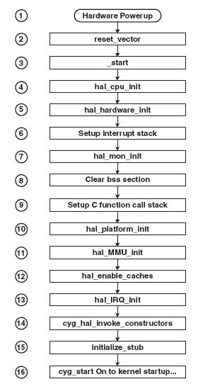 下面这幅图来自《EMBEDDED SOFTWARE DEVELOPMENT WITH ECOS》书中,介绍了一款PowerPC的设备启动流程。