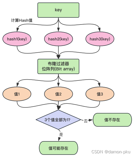 注意:布隆过滤器只能精确判断数据不存在的情况,而对于存在,我们只能说是可能存在,因为存在哈希冲突的情况,当然这个概率非常低。