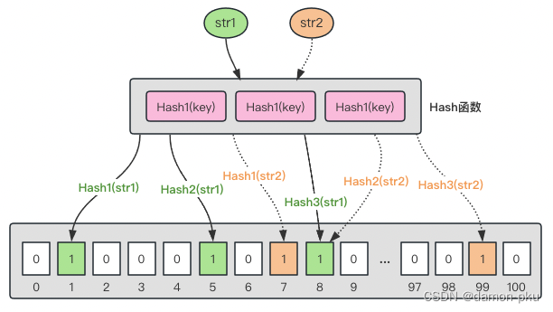 2)对str2,进行三次哈希,确定其在位阵列中的位置。三次哈希,对应的下标分别是7、8、99,将原始数据从0变为1;