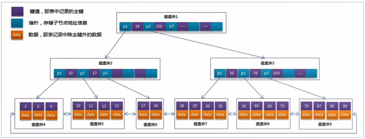 B+树:B+Tree是(MySQL使用最频繁的一个索引数据结构)数据结构,B+Tree每个节点可以存放多个数据,相比二叉树,树的高度更低,磁盘IO更少,查询效率更高。因为是树型结构,所以更适合用来处理排序,范围查找等功能。