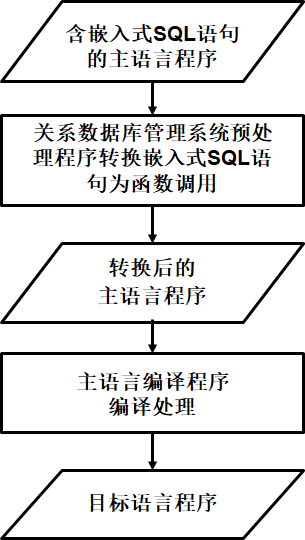 对嵌入式SQL,数据库管理系统一般采用预编译方法处理,即由数据库管理系统的预处理程序,对源程序进行扫描,识别出嵌入式SQL语句,把它们转换成主语言调用语句,以使主语言编译程序能识别它们;然后由主语言的编译程序,将纯的主语言文件编译成目标程序。嵌入式SQL基本处理过程如下图所示: