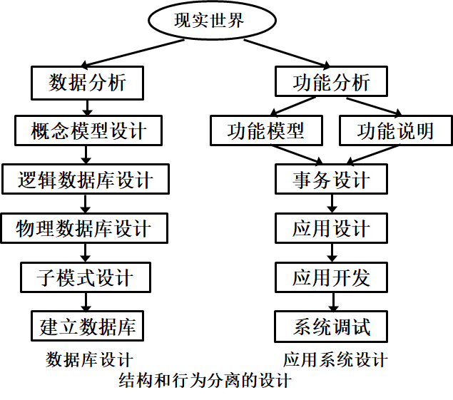 在早期的数据库应用系统开发过程中,常常把数据库设计和应用系统的设计分离开来,如下图所示。由于数据库设计有其专门的技术和理论,因此需要专门讲解数据库设计。但这并不等于数据库设计和在数据库之上开发应用系统是相互分离的,相反,必须强调设计过程中、数据库设计和应用系统设计的密切结合,并把它作为数据库设计的重要特点。