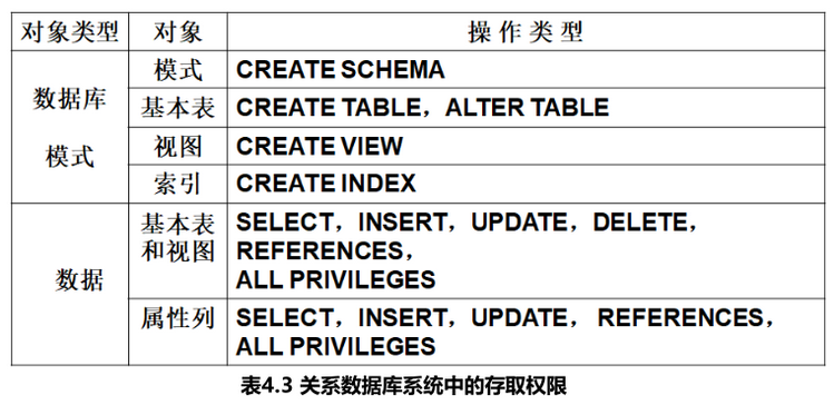 在非关系系统中,用户只能对数据进行操作,存取控制的数据库对象也仅限于数据本身。在关系数据库系统中,存取控制的对象不仅有数据本身(基本表中的数据、属性列上的数据),还有数据库模式(包括数据库、基本表、视图和索引的创建等)。下表给出了关系数据库系统中的主要存取权限。