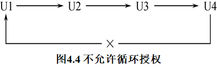 如果指定了 with grant option 子句,则获得某种权限的用户还可将这种权限再授予其他的用户。如果没有指定 with grant option 子句,则获得某种权限的用户只能使用该权限、不能传播该权限。SQL标准允许具有 with grant option 的用户,把相应权限或其子集传递授予其他用户,但不允许循环授权,即被授权者不能把权限再授回给授权者或其他祖先,如图4.4所示: