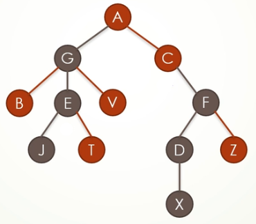 A是轻儿子,于是一直往G, E, J方向走,得到重链A -> G -> E -> J;结点C是轻儿子,于是一直往F, D, X方向走,得到重链C -> F -> D -> X。