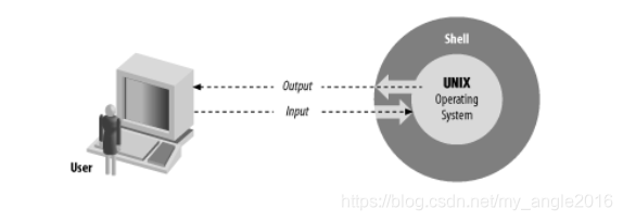 Shell是命令解释器(command interpreter),是Unix操作系统的用户接口,程序从用户接口得到输入信息,shell将用户程序及其输入翻译成操作系统内核(kernel)能够识别的指令,并且操作系统内核执行完将返回的输出通过shell再呈现给用户,下图所示用户、shell和操作系统的关系: