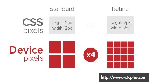 在 Apple 的视网膜屏(Retina)中,每 4 个像素为一组,渲染出普通屏幕中一个像素显示区域内的图像,从而实现更为精细的显示效果。此时, 250px 的元素跨越了 500 个物理像素的宽度。
