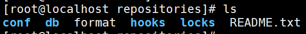 执行上面的命令后,自动建立 repositories 库,查看 /opt/svn/repositories(路径和库名可以根据自己的需要修改) 文件夹发现包含了 conf,db,format,hooks,locks, README.txt 等文件,说明一个 SVN 库建立完成。