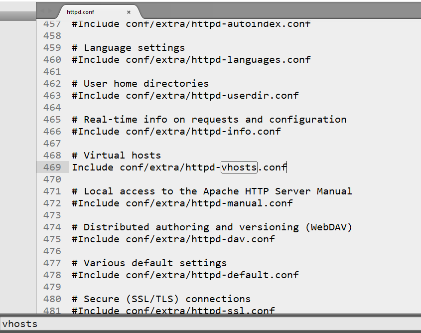 - 引入Include conf/extra/httpd-vhosts.conf配置文件,也就是把#号去掉