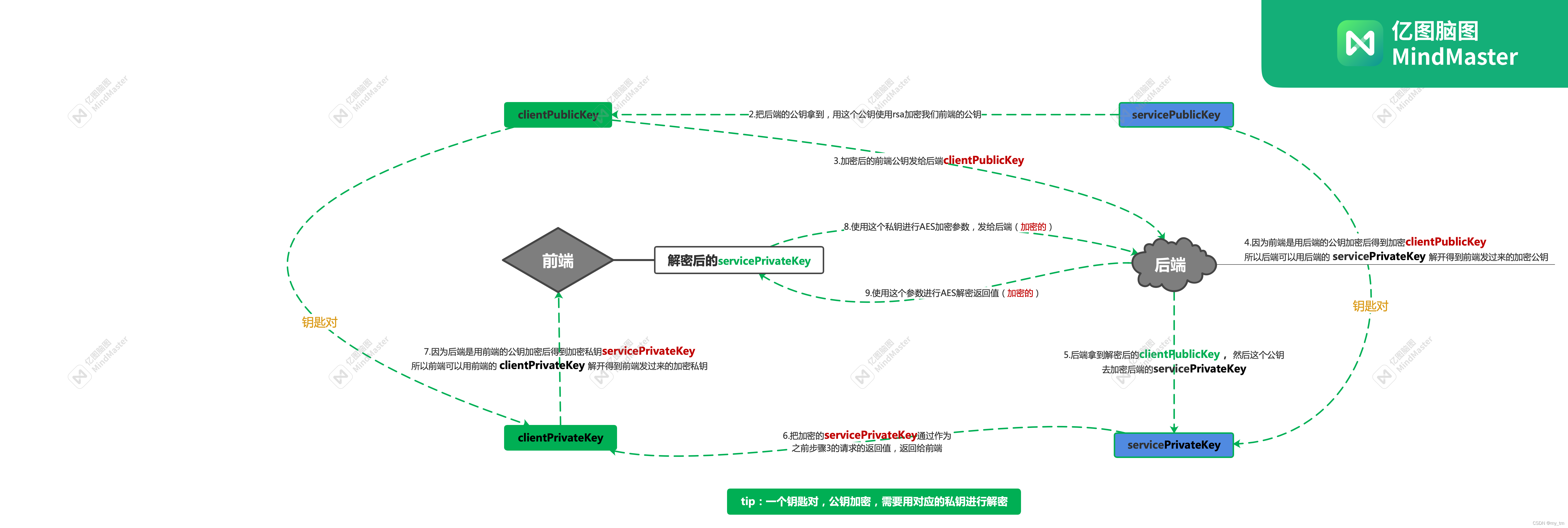 3.请求获取到后端的公钥,把后端的公钥(servicePublicKey)作为加密的钥匙把前端的公钥(clientPublicKey)加密后,把加密后的clientPublicKey作为参数发给后端,后端返回一个加密的钥匙(servicePrivateKey),这个servicePrivateKey用来让AES对参数的加密解密。