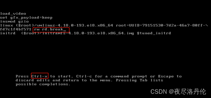 把原先的ro参数更改为rw参数,并加入rd.break参数使内核启动完成后不进行后续的初始化程序,这样系统会进入单用户模式