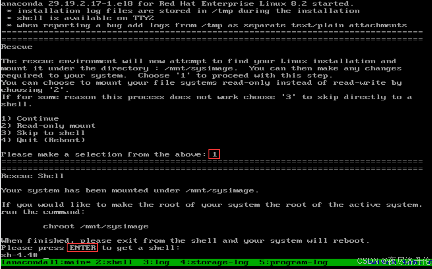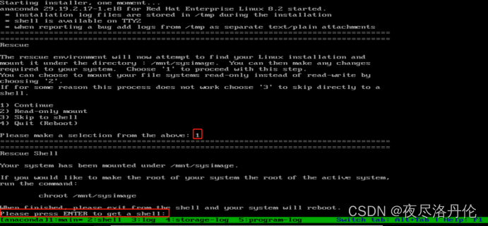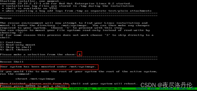 然后选择1选项来继续挽救步骤,会告诉系统已经被挂载红框中的目录了,接着按回车键打开shell: