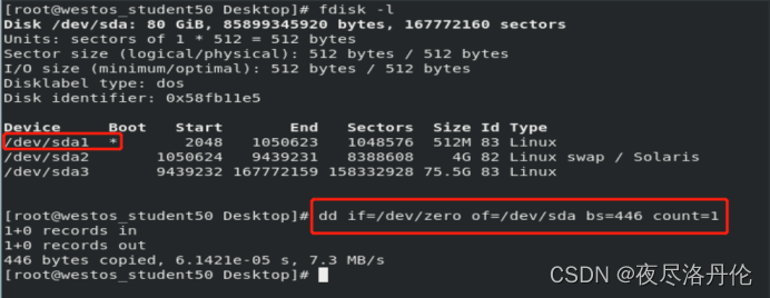带*星号的分区 /dev/sda1 分区为boot分区,若执行下图红框内的命令则会使该分区上的mbr数据损坏,而mbr数据丢失系统会因为找不到启动分区而停止启动,重启主机后就无法进入系统: