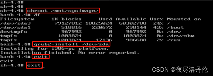 进入硬盘里的真实系统后输入下图中的命令来在boot分区所在的磁盘sda中重新安装上mbr(主引导记录数据),然后输入两次exit来退出挽救程序:
