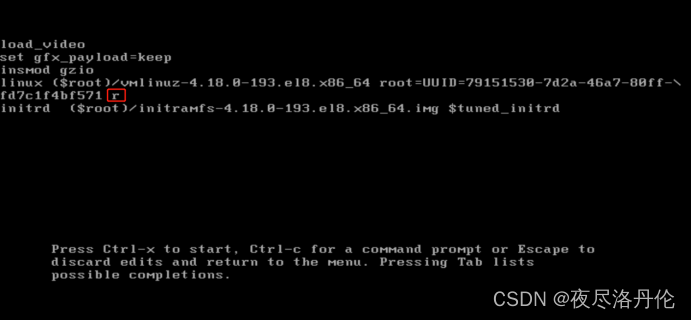 第二条:加载内核并只读挂载根分区(/vmlinux-4.18.0-193.el8.x86_64为内核,ro为只读挂载,/dev/sda3为根分区的位置)