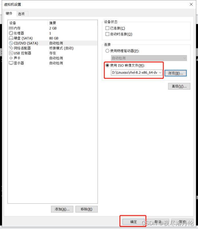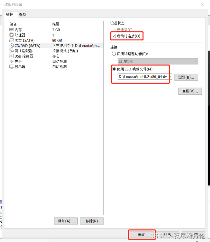 选择使用ISO镜像然后选择镜像路径,再选上启动时连接,最后确定: