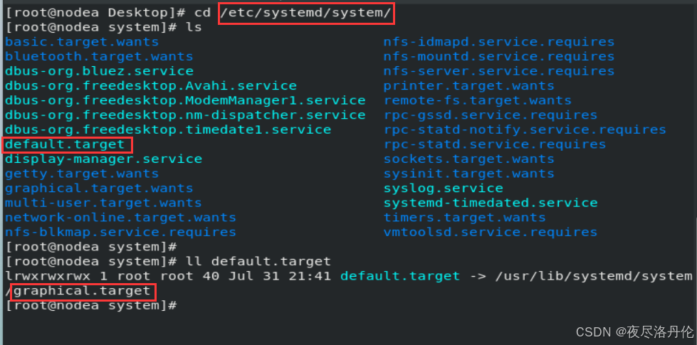 在这个system目录中,有个软链接——default.target,它链接到的文件就为当前系统启动级别文件,可以看到当前是graphical,即启动级别为5,有图形的网络模式: