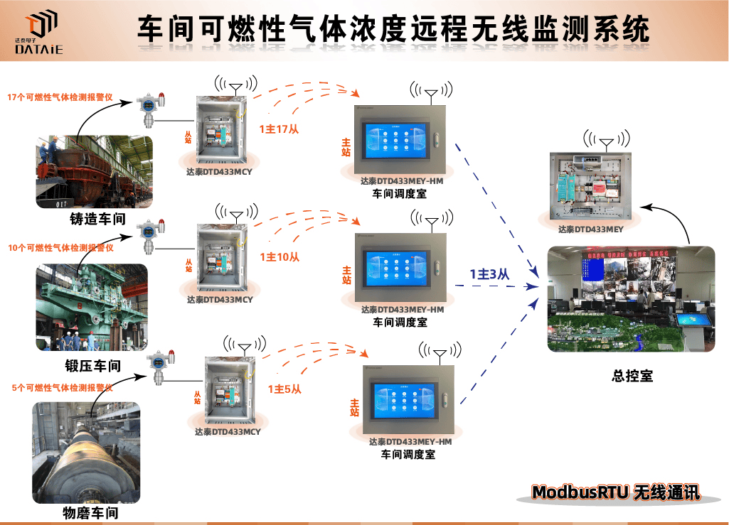 由于现场工作环境复杂,钢架结构隔挡较多,可燃气体报警器安装地点分散,距离不等,现场通讯设备的选择需要格外注意稳定性与抗干扰性。考虑上述因素,达泰PLC无线通讯专家决定采用达泰工业级无线通信装置-DTD433MY来实现客户提出的技改需求。