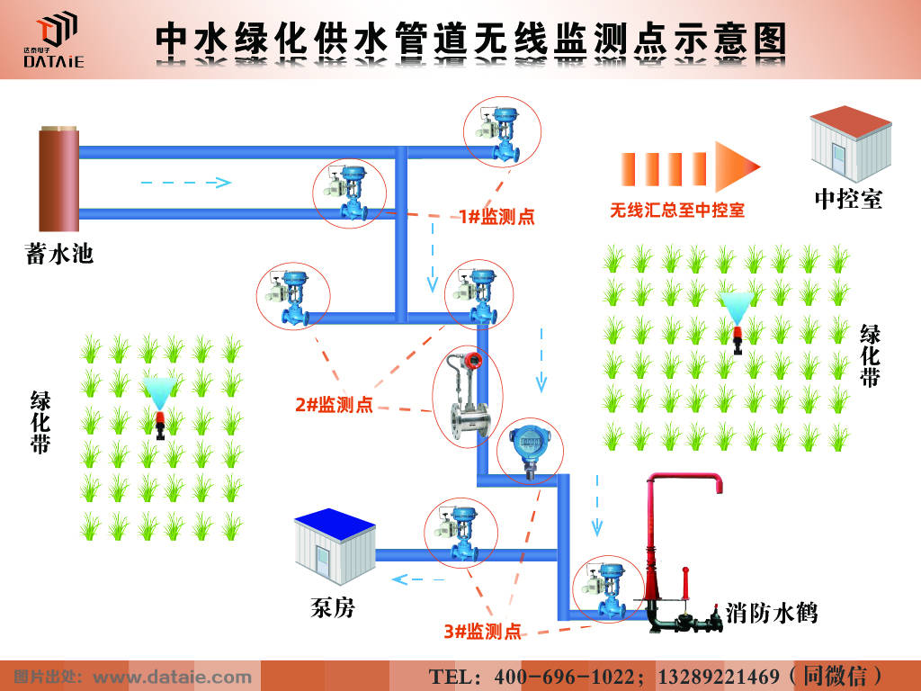 本次技改是达泰PLC无线通讯专家团队应国内某污水处理厂提出的需求而专门定制的解决方案。在工厂承接的绿化灌溉项目中,需要将厂内净化处理过的中水经由20公里的绿化管道沿途输送到城市内绿化灌溉区、泵房及消防水鹤。工厂提出要在主控室上位机端同时控制这几个分散地点的阀门并监测流量数据。