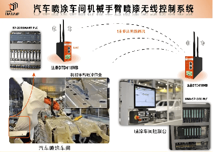 中车某BBA汽车生产线的喷涂车间的喷涂机械手臂需要实现无线控制。喷涂车间有3台喷涂机械手臂同时作业,由车间旁的控制台HMI来远程无线控制完成汽车及其零部件的喷涂工作。由于喷涂车间油漆涂料具有腐蚀性,不方便布线,因此采用无线方式来实现车间控制台HMI与3台喷涂机械臂之间的无线通讯要求,从而提升了涂装的安全稳定性及生产效率。