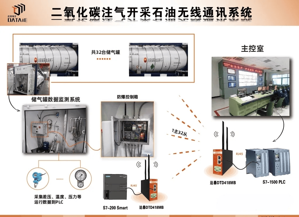 考虑上述因素,达泰PLC无线通讯团队决定使用多台达泰DTD418MB西门子PLC无线通讯终端,通过RJ45接口在S7协议下(兼容MODBUS TCP/IP协议),完成中控室和罐体1主多从的PLC无线以太网通讯。在中控室S7-1500 PLC端及多辆罐装车的S7-200 SMART端分别安装一块达泰DTD418MB西门子PLC无线通讯终端,即可以实现中控室与多辆液态二氧化碳罐装车之间数据无线传输。