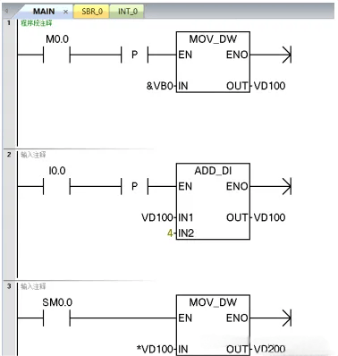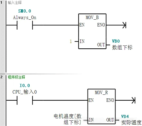 程序段1是将"1"传送给VB0地址,程序段2是当接通I0.0时,将电机温度[1]里的值传送给VD4。如果将VB0中的数值改为2,则可以将将电机温度[2]里的值传送给VD4,这样就很方便的实现了间接寻址的功能。