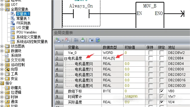 (1)在"全局变量表"中建立一个名称为"电机温度"的数组,其中包括5个元素,其下标值是从0至4,每个元素的数据类型都是"REAL"。如电机温度[0]是第0个元素,如电机温度[1]是第1个元素,那么我们编程的时候只要改变中阔号的里数值就改变了地址。如下图所示"电机温度[0]"的地址是DB2.DBD4,"电机温度[1]"的地址是DB2.DBD8.