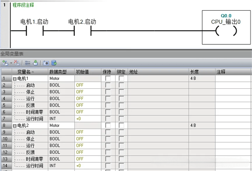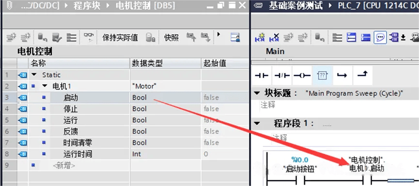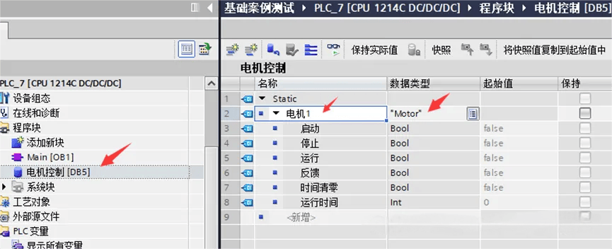 新建DB数据块,然后在数据块中新建名称为“电机1”的数据。其中“Motor”包含的变量有“启动”“停止”“运行”等。