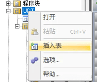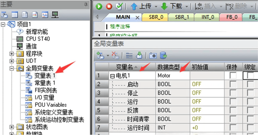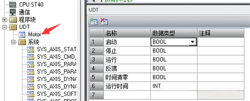 在软件的项目树中点击“插入表”,然后新建1个名字为“Motor”名称的UDT数据类型。其中包含“启动”“停止”“运行”等变量。