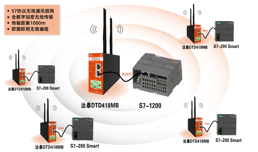 本方案以西门子S7-1200和S7-200SMART PLC为例,在S7专用协议下实现无线以太网通信实现过程。在本方案中采用了西门子PLC无线通讯终端——DTD418MB,作为实现无线通讯的硬件设备。