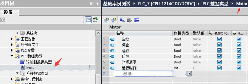 在软件的项目树中的数据类型下新建名称为“Motor”的UDT数据。