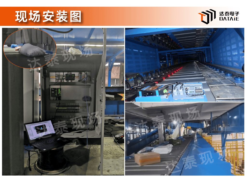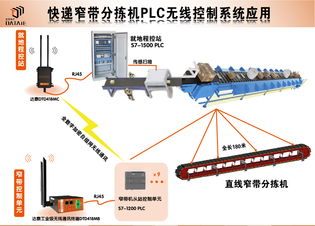 用户现场中,窄带分拣机全长为180米,内部分为9个控制单元,是以西门子S7-1200 PLC作为从站控制单元;就地PLC控制系统则是选用西门子S7-1500 PLC作为核心控制主站(主控柜在闸口扫描处侧边放置)。达泰无线通讯技术人员考虑到快递自动分拣高速响应、数据量频繁的工作特性,决定采用欧美系PLC无线通讯终端DTD418M系列产品来完成窄带分拣机的通讯需求。主站采用DTD418MC户外PLC无线通讯终端,安装在就地PLC控制柜处,从站采用DTD418MB,安装在9个窄带从站控制单元。为确保窄带分拣机的高频连续稳定运行,该无线通讯终端内置EMI抗干扰单元,采用工业级全数字无线加密技术,无线传输覆盖距离为1KM,满足现场复杂环境运行的同时,快速响应实时完成分拣作业。