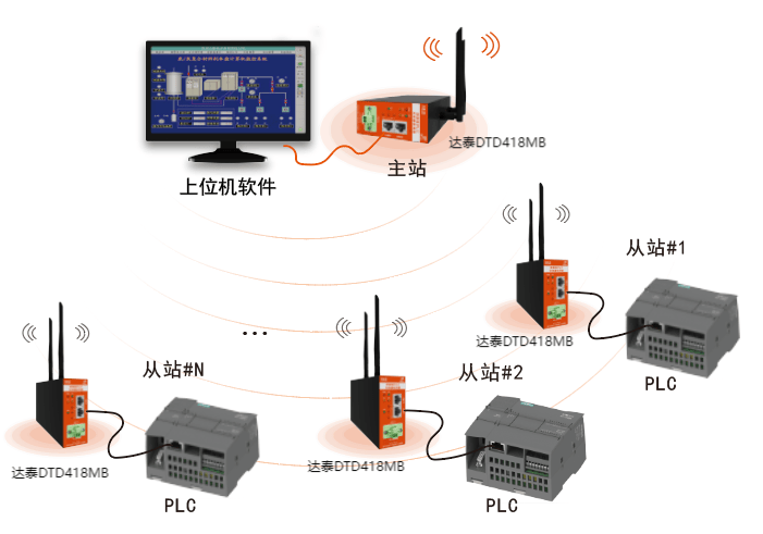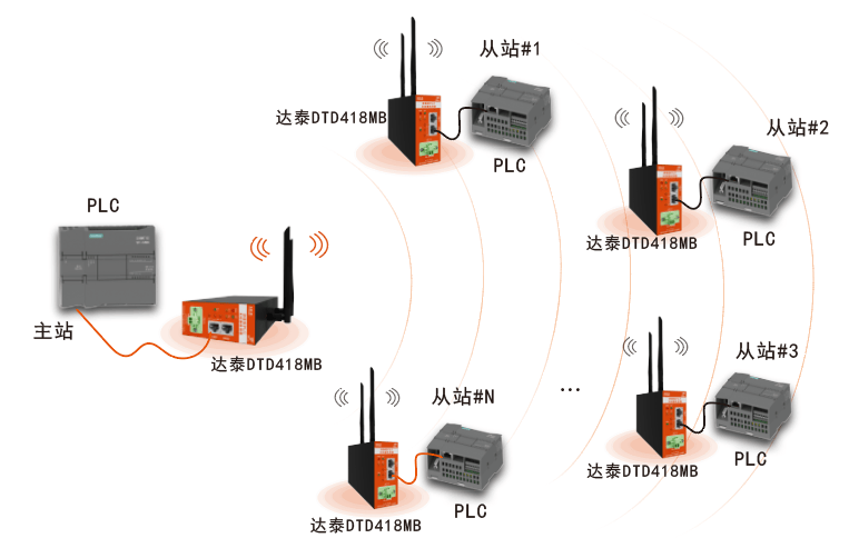 PLC与PLC之间的无线通讯,支持点对点及点对多点,实现多台PLC之间的以太网无线通讯。
