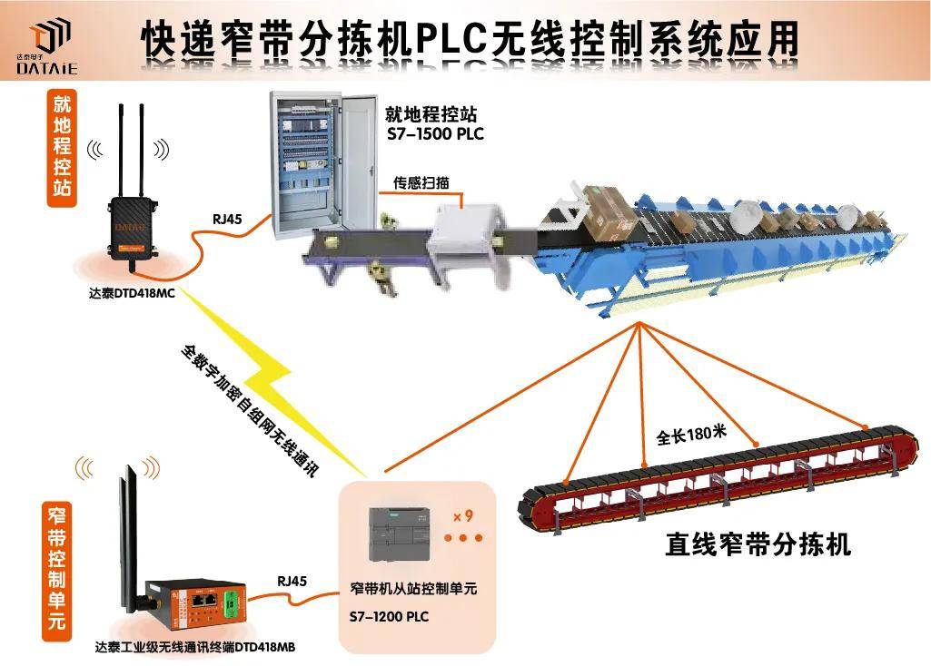 本次无线应用主要是将某快递分拣站的直线窄带分拣机传感单元扫描到的货物信息通过就地PLC控制系统下发到分拣机各从站控制单元,从而无线控制分拣机控制单元滑轮转向在预设隔口快速完成分拣,实现分拣过程自动化。