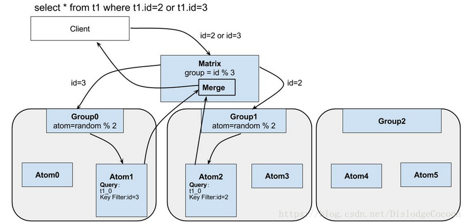 i)结果集合并。Matrix将Atom层的返回的各个结果集进行合并Merge,返回给Client端。