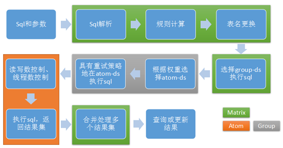 TDDL的工作流程类似上图,client发送一条SQL的执行语句,会优先传递给Matrix层。由Martix 解释 SQL语句,优化,并根据查询条件路由到各个group,转发sql进行查询,各个group根据权重选择其中一个Atom进行查询,各个Atom再将结果返回给Matrix,Matrix将结果合并返回给client。具体的工作流程的可以拆分成如下图: