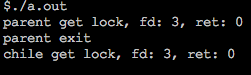 运行结果如图,子进程持有锁,并不影响父进程通过相同的fd获取锁,反之亦然。