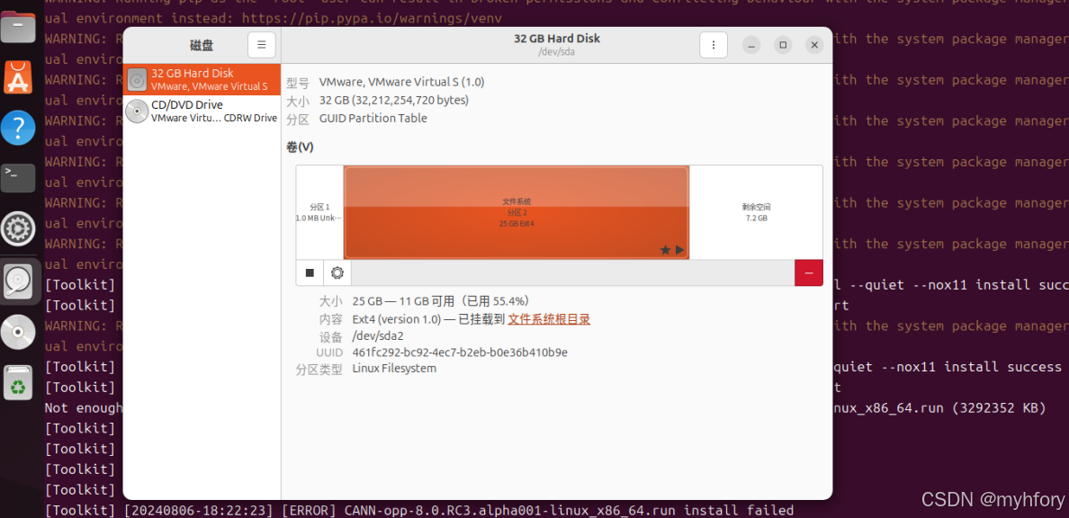 1.安装CANN包的时候可能会安装失败,一般是因为空间不足导致的,可以用虚拟机的磁盘管理器看下空间占用情况