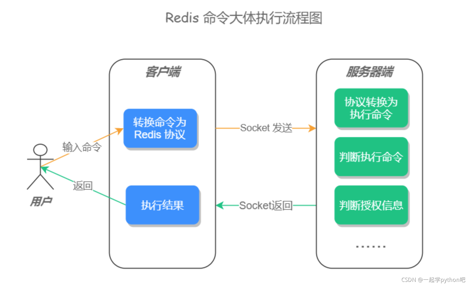 一条命令的执行过程有很多细节,但大体可分为:客户端先将用户输入的命令,转化为 Redis 相关的通讯协议,再用 socket 连接的方式将内容发送给服务器端,服务器端在接收到相关内容之后,先将内容转化为具体的执行命令,再判断用户授权信息和其他相关信息,当验证通过之后会执行最终命令,命令执行完之后,会进行相关的信息记录和数据统计,然后再把执行结果发送给客户端,这样一条命令的执行流程就结束了。如果是集群模式的话,主节点还会将命令同步至子节点,下面我们一起来看更加具体的执行流程。