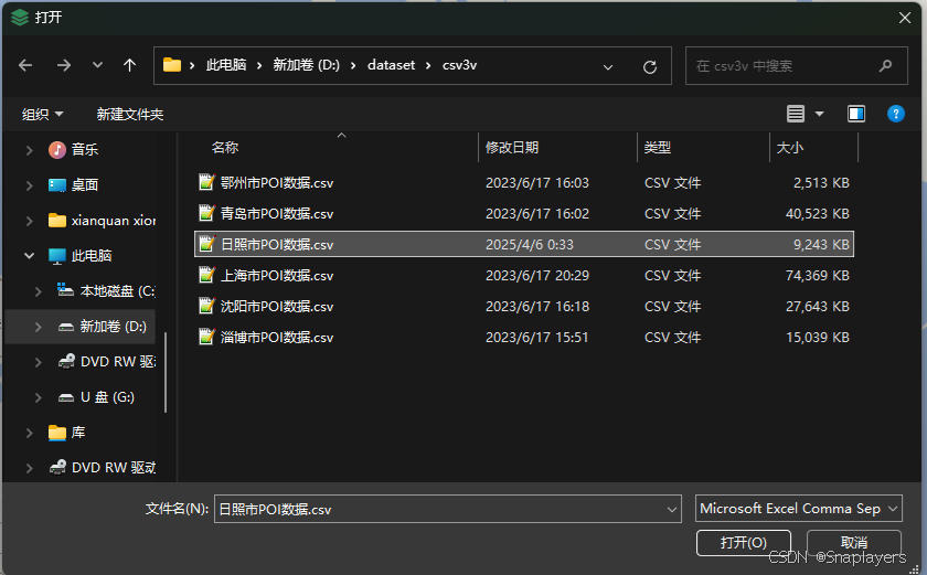 Snaplayers加载CSV数据格式 1、加载CSV数据格式操作 2、在打开对话框中选择CSV数据文件 3、选择经纬度字敦 4、加载CSV数据格式操作结果 可以看到,左边是图层的属性数据表格,中间就是点图层,表示加载成功。 Snaplayers研发团队承诺:国产轻量级桌面GIS软件Snaplayers永久免费并持续更新