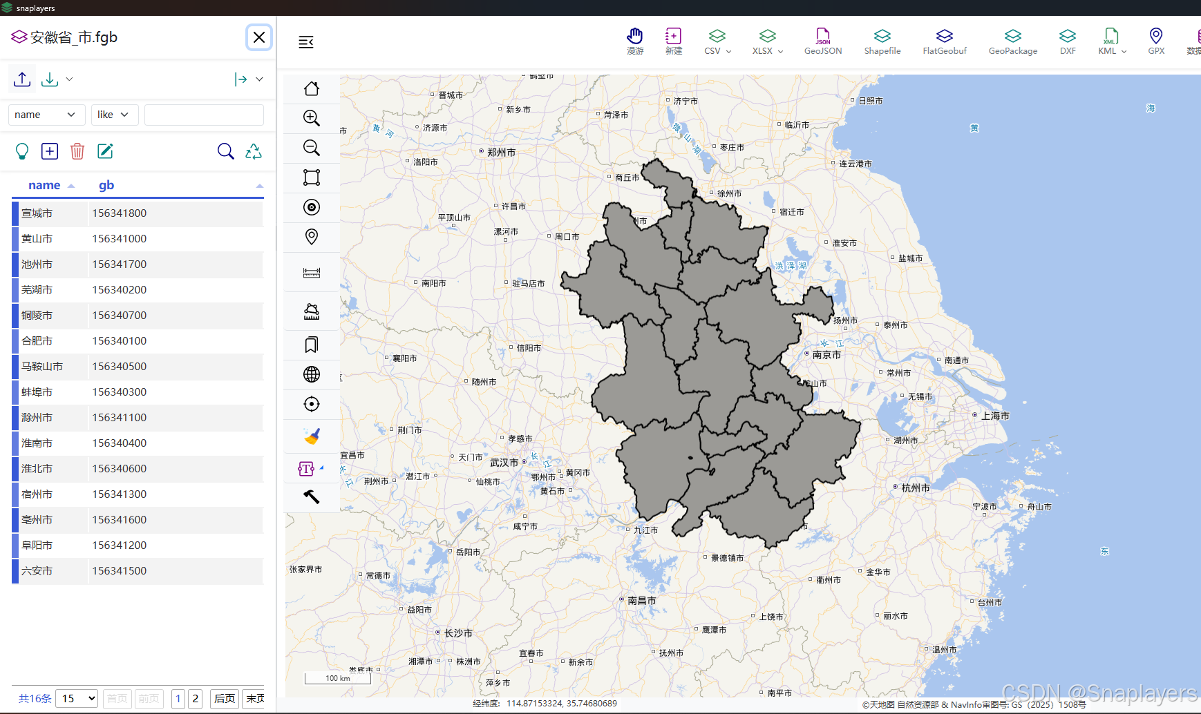可以看到,左边是图层的属性数据表格,中间就是FlatGeobuf(fgb)数据图层,表示加载成功。
