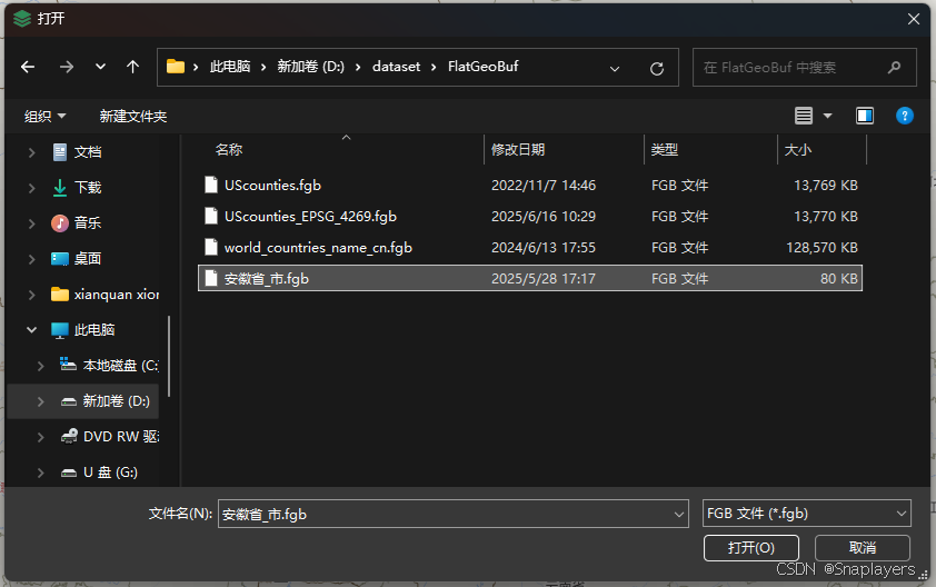 2、在打开对话框中选择FlatGeobuf(fgb)数据文件