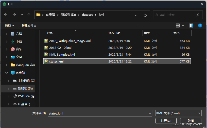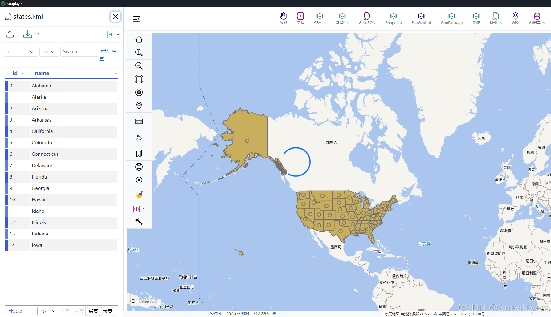 Snaplayers加载KML数据格式 1、加载KML数据格式操作 2、在打开对话框中选择KML数据文件 3、加载KML数据格式操作结果 可以看到,左边是图层的属性数据表格,中间就是点图层,表示加载成功。 Snaplayers研发团队承诺:国产轻量级桌面GIS软件Snaplayers永久免费并持续更新