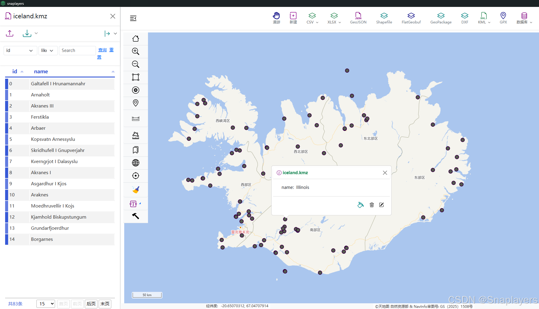 Snaplayers加载KMZ数据格式 1、加载KMZ数据格式操作 2、在打开对话框中选择KMZ数据文件 3、加载KMZ数据格式操作结果 可以看到,左边是图层的属性数据表格,中间就是点图层,表示加载成功。 Snaplayers研发团队承诺:国产轻量级桌面GIS软件Snaplayers永久免费并持续更新