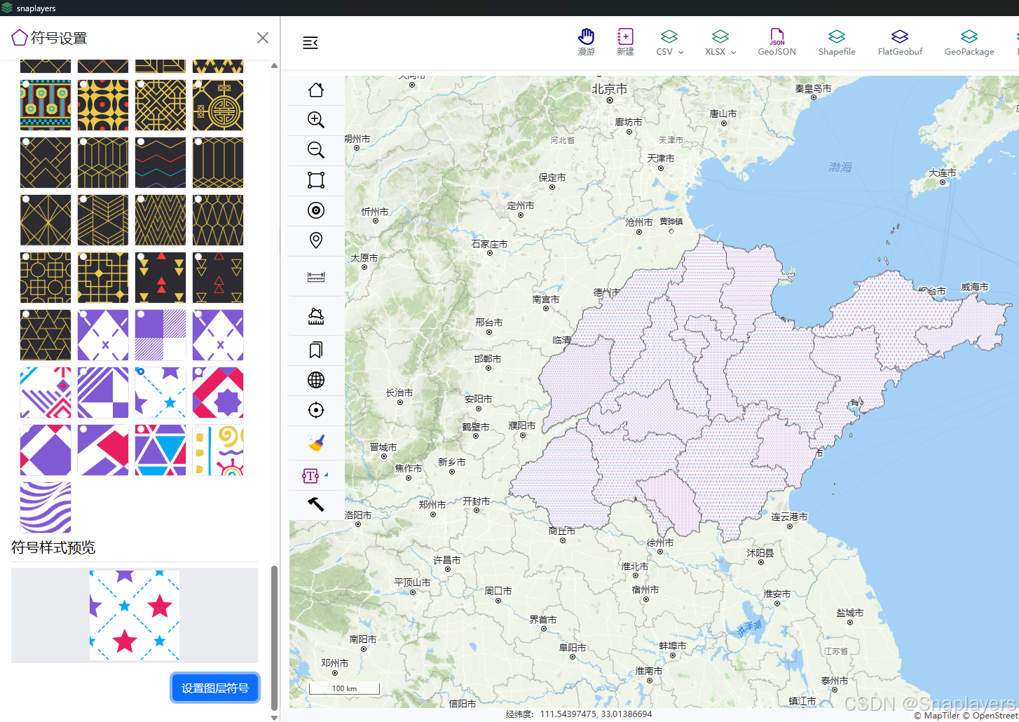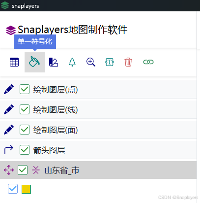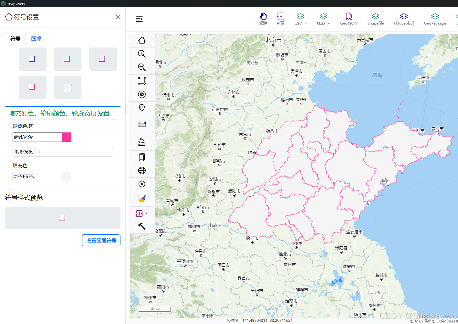 2、加载该图层后,桌面GIS软件会分配该图层多边形轮廓的宽度为2,随机分配多边形轮廓颜色、随机多边形填充颜色,如图