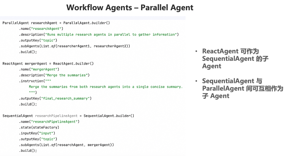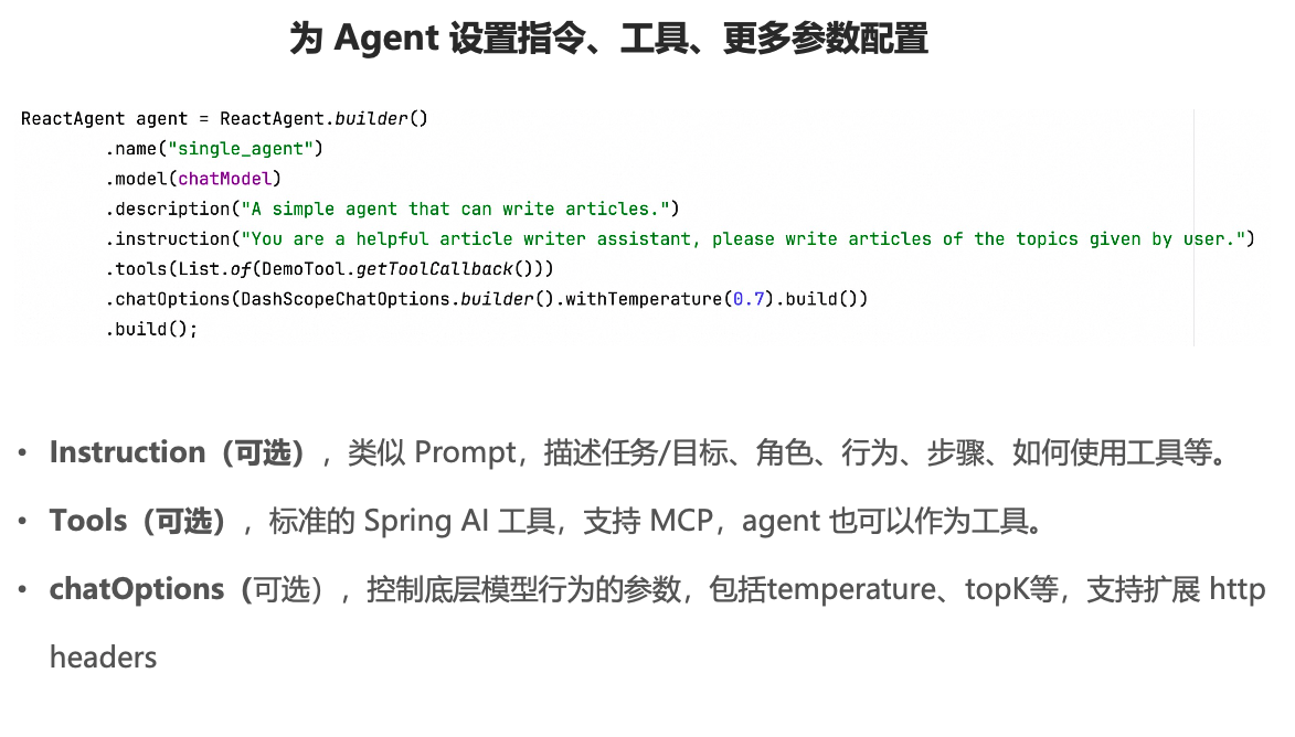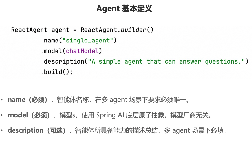 主流Agent开发范式:Agent、Workflow、Multi-Agent 等主流智能体开发模式Spring AI Alibaba Graph:如何使用 Spring AI Alibaba 定义和编排 Agent 格式分布式Agent:基于 A2A 协议与 Nacos 的远程分布式 AGent 架构Spring AI Alibaba Studio Platform:Agent 开发、调试、评估、部署平台