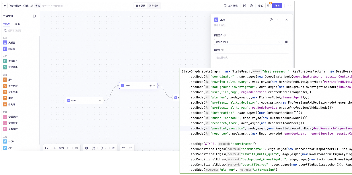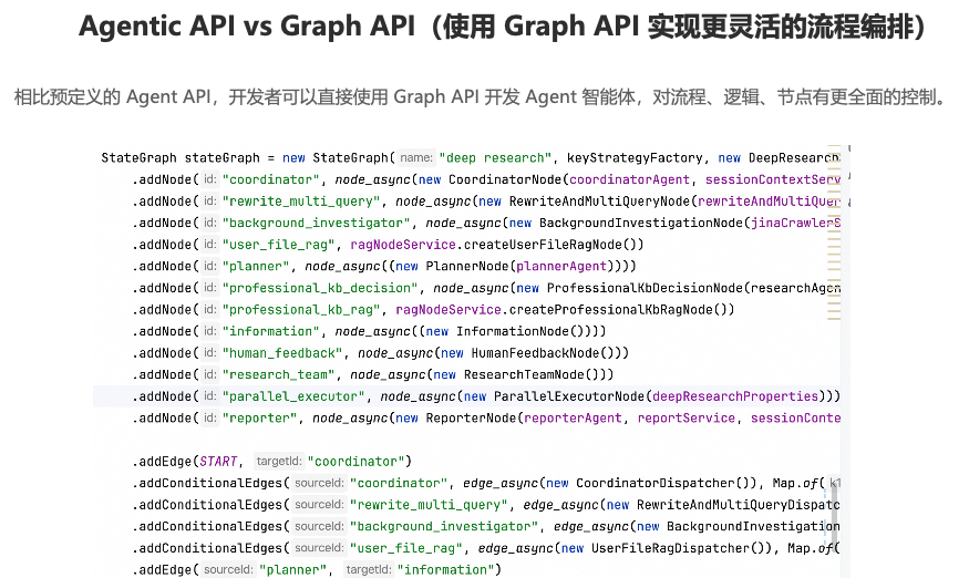 | 流程编排 | 无 | 预先定义好的流程,如串行、并行、回环等 | 支持大模型自主决策的流程控制 |