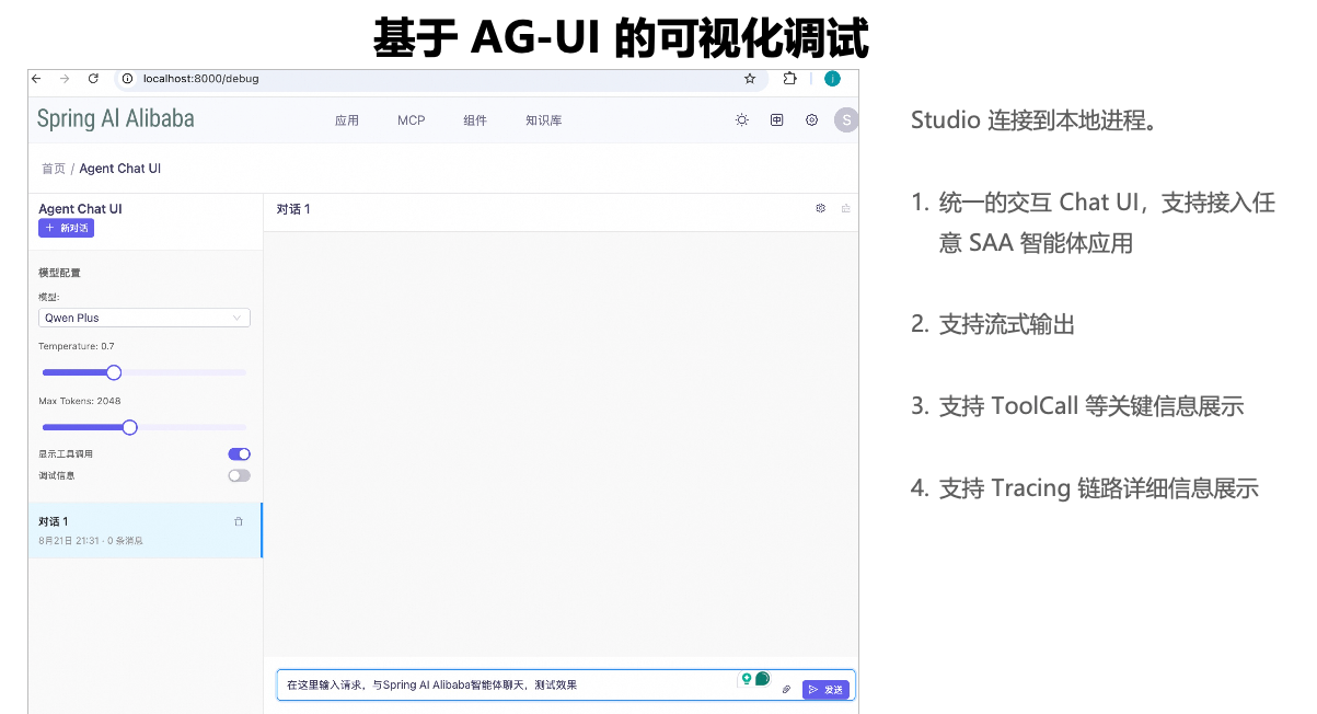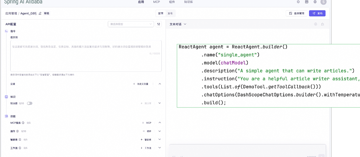 除了编码 Agent API,Spring AI Alibaba Studio 提供了可视化创建智能体的 UI 界面,调试完成可快速转为工程代码