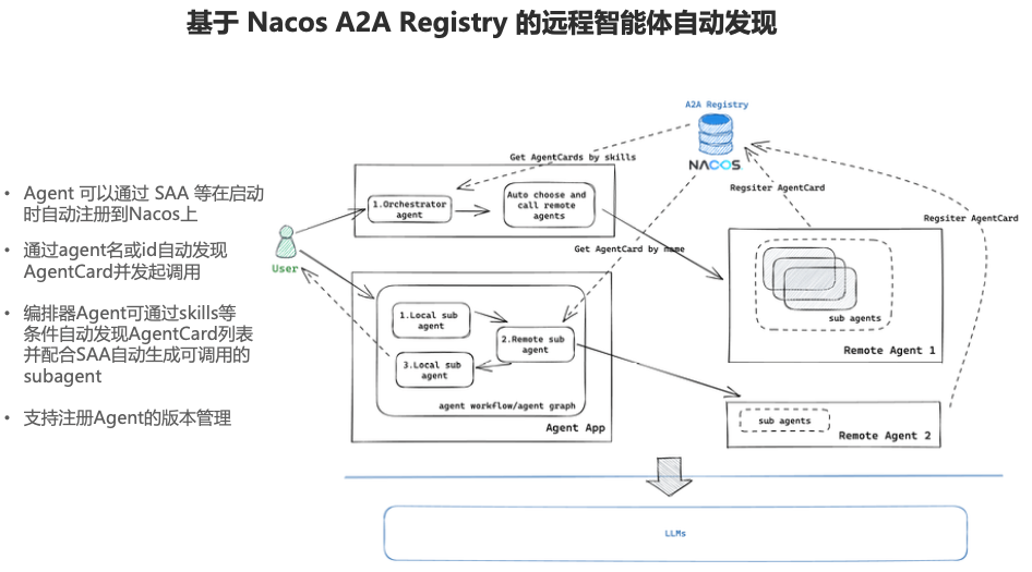 同时也和 Nacos 社区合作,可将 Agent 自动注册到 Nacos 上,供其他 Agent 远程调用